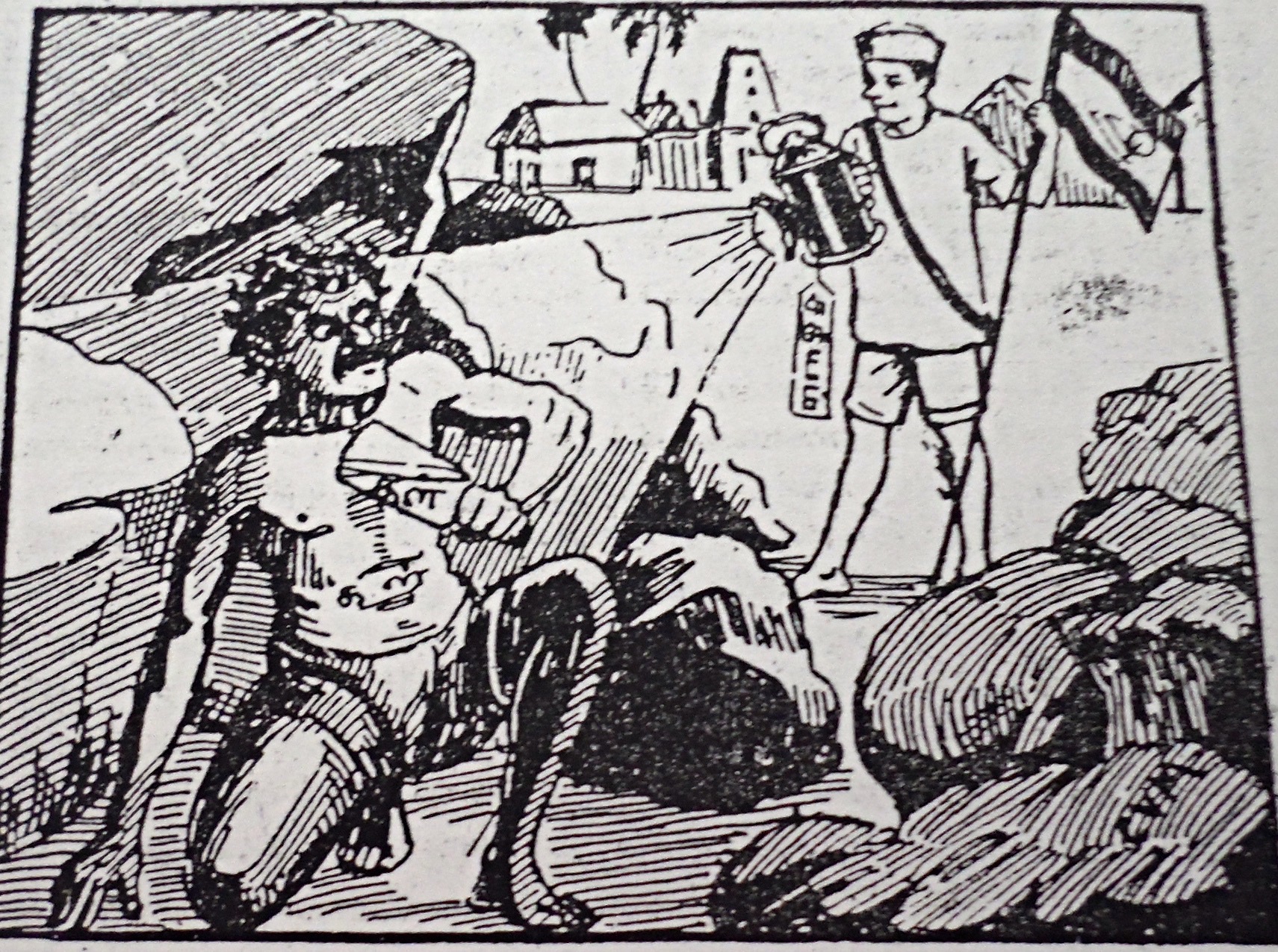 A volunteer of the Indian nationalist movement shining “the bright light of redemption” on “a savage drinker.” (Source: Ananda Vikatan Tamil magazine, 1935)